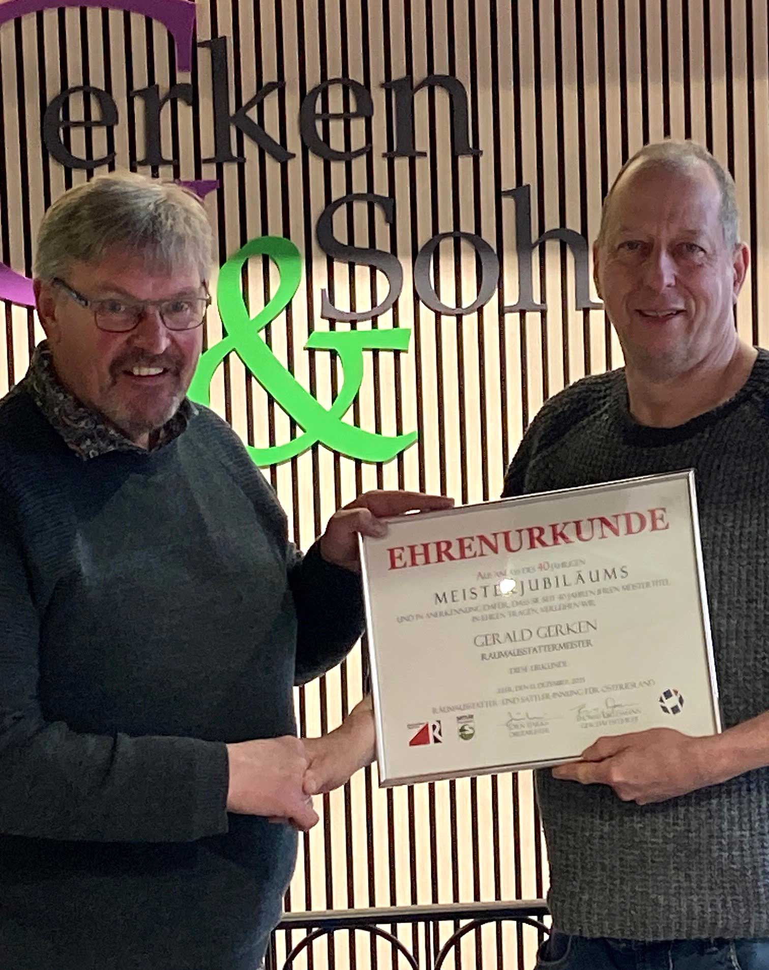 - Gerald Gerken, Raumausstattermeister, Hage: 40-jähriges Meisterjubiläum (Meisterprüfung am 13.12.1985) – Bild ansehen
